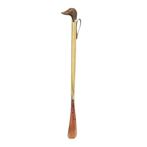El Calzador Palo Natural, Pato es la herramienta perfecta para aquellas personas que experimentan dificultades en el movimiento o simplemente necesitan ayuda para calzarse sin esfuerzo. Con un diseño innovador que combina madera de acacia flameada, acetato en tonos marrones y conchas, y anillas de latón, este calzador se destaca por su funcionalidad y durabilidad.