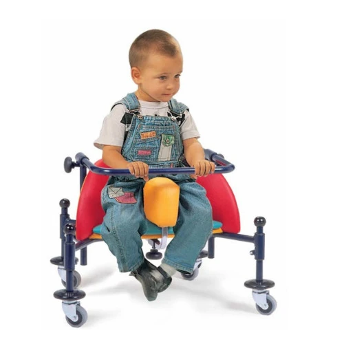 La forma triangular del asiento evita la excesiva extensión de la cadera y del tronco, permitiendo la alineación entre la cabeza y el torso. Esta característica única favorece la adquisición de una postura adecuada y facilita la gestión de movimientos con los brazos y la rotación del tronco. Además, su diseño y color atractivos hacen que sea aceptado como un juguete, fomentando la curiosidad del niño y su autonomía.