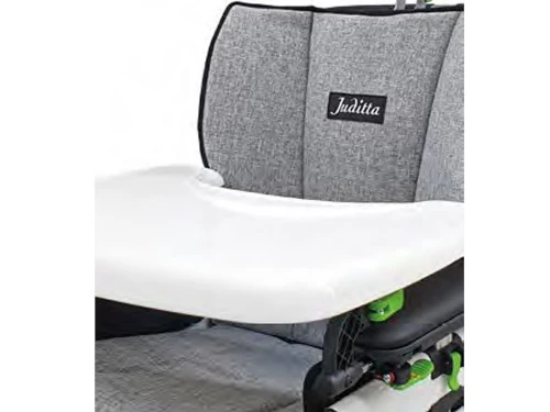 Tanto el asiento como el respaldo de la silla JUDITTA están fabricados con materiales transpirables que permiten la circulación del aire, creando un microclima óptimo para la piel del paciente. Además, el reposacabezas multi regulable proporciona estabilidad y comodidad, siguiendo la forma del respaldo para un correcto alineamiento entre la cabeza y el tronco.
