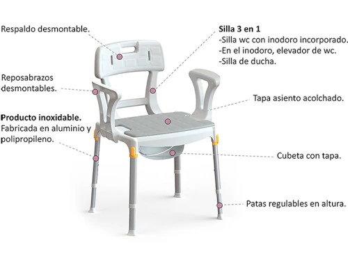 - Versatilidad 3 en 1: funciona como silla con inodoro, elevador para inodoro y silla de ducha, adaptándose a tus necesidades diarias.