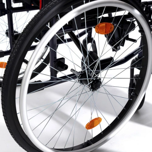 Fabricada en aluminio inoxidable, esta silla combina ligereza y robustez. Las ruedas antipinchazos de PU de 24″ te ofrecen: