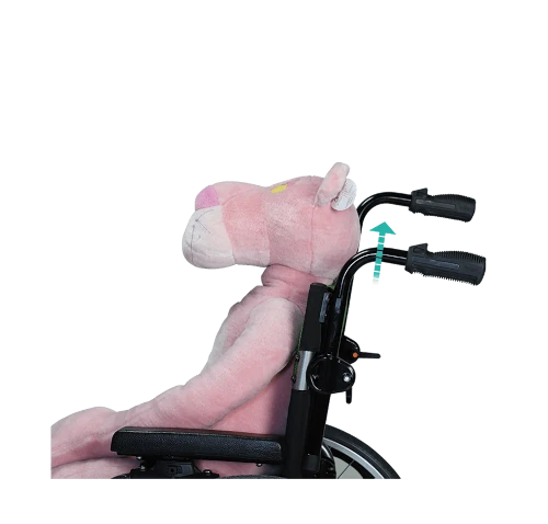 Las empuñaduras ajustables en altura de la silla de ruedas Flexx Junior facilitan el trabajo de los acompañantes al empujarla. Estas empuñaduras se pueden ajustar según las preferencias individuales, mejorando la experiencia de propulsión y la comodidad durante su uso.