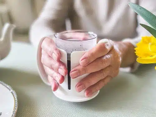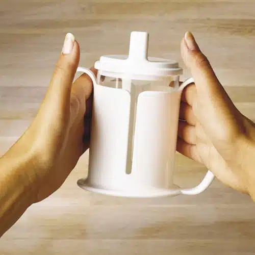El Vaso ETAC ha sido diseñado con un soporte especial que te permite agarrarlo con seguridad utilizando ambas manos, incluso si tienes poco agarre o tono muscular débil. Su mango grande y borde de apoyo facilitan el agarre tanto para diestros como para zurdos, brindándote la flexibilidad que necesitas en cada momento.